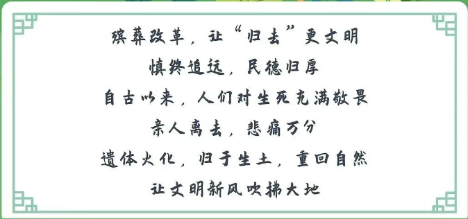 在我国传统丧葬文化中,人死之后讲究入士为安,要让逝者走的风光、体面,更不能破坏遗体,因此很多人不愿意进行火葬,他们认为火葬是“挫骨扬灰"。民间这种朴素的丧葬思想无可厚非,但从我们国家的具体情况来考虑,殡葬改革势在必行,火葬取代土葬是必然。