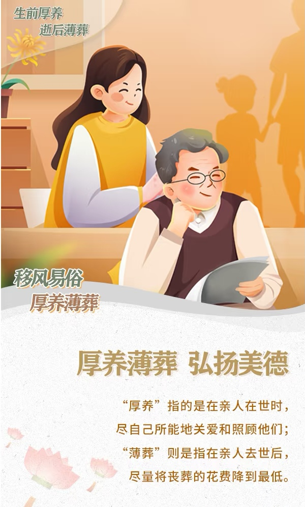 祭而丰不如养之厚,老人在世时尽孝心、厚赡养,老人去世后,提倡丧事从简,控制治丧时间和丧葬规模,不举办演艺、法事等时间长、排场大、花费多的丧事活动。