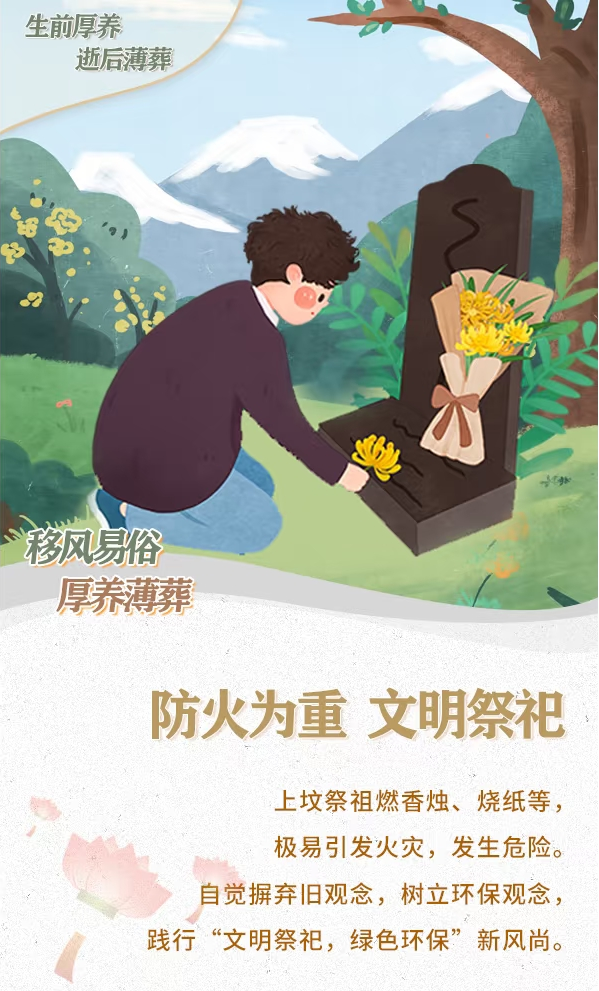 传统祭祀方式极易引发火灾,发生危险。我们要遵守社会公德,树立环保意识,自觉摒弃燃放鞭炮、焚烧香烛纸钱等不文明的祭扫方式,通过植一棵树、献一束花、分享一段祭文等方式,感恩传承孝道,绿色文明祭扫。