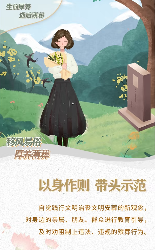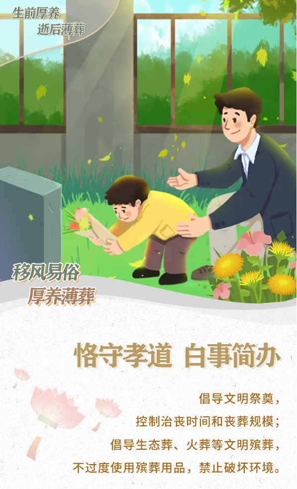 “但存方寸地,留与子孙耕”,倡导采用骨灰格位存放等少占土地、少耗资源的安葬方式,使安葬活动更好地促进人与自然和谐发展;不在出殡沿线使用高音喇叭、抛撒冥币纸钱、燃放烟花爆竹等噪声扰民和污染环境卫生的行为,以简朴、环保的新礼俗表达对逝者的哀思。