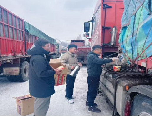 在全力抢通道路的同时,街道也关注到滞留货车司机的实际困难。考虑到拥堵期间司机们饮食不便,工作人员紧急调配了一批方便食品与饮用水,并徒步向被困司机进行分发,提供了必要的生活物资保障。