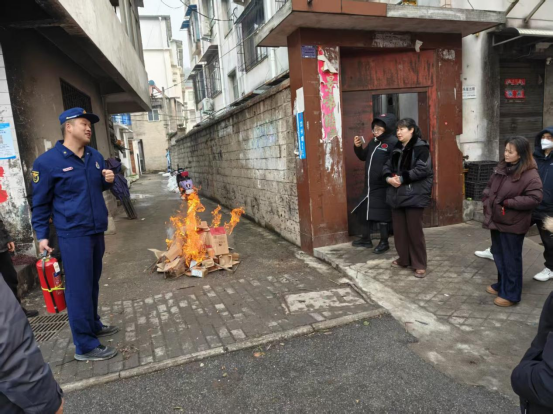 在灭火器实操教学环节,工作人员聚焦“提、拔、握、压”核心操作口诀,现场演示灭火器使用步骤:提起灭火器摇匀药剂、拔掉保险销、握住喷管对准火源根部、按压把手均匀扫射。同时强调,灭火时需站在上风方向,保持3至5米安全距离,确保操作规范有效。