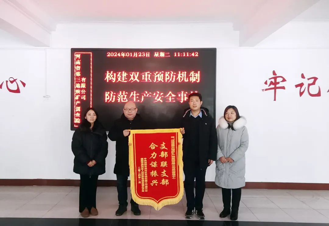 1月23日,浉河区老城街道党工委委员、副主任车飞、组统委员王皓冬和东方红社区党支部书记王林燕一行,向河南省地矿三院送去“结对共建聚合力、携手并肩谱新篇”“支部联支部、合力谋振兴”两面锦旗,感谢地矿三院广大职工多年来对老城街道工作的支持。公司总经理廉宏涛、副总经理级干部付英林携基地管理中心负责人接收了锦旗。