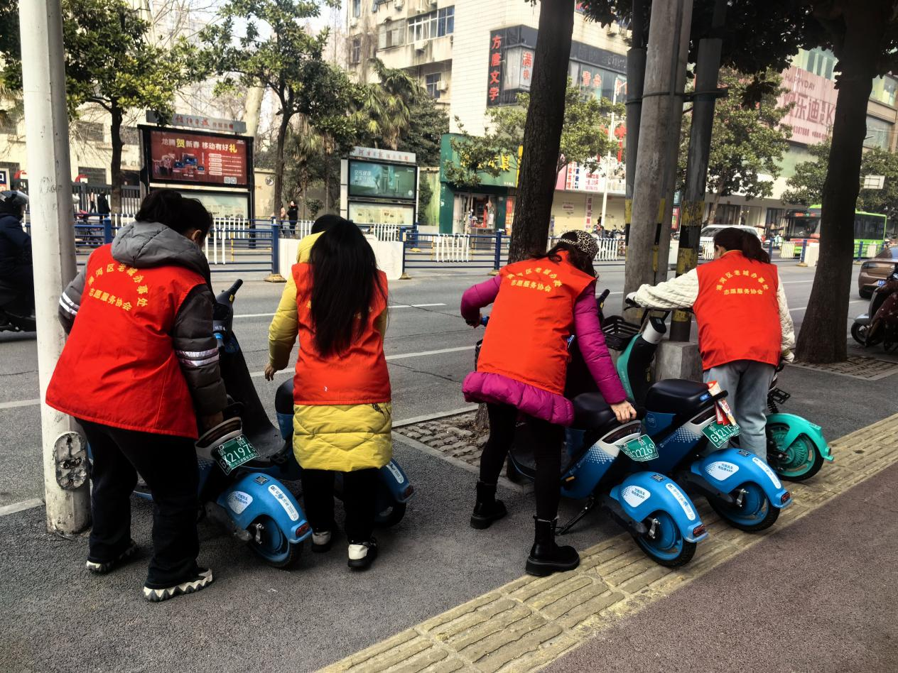 胜利社区组织志愿者对东方红大道沿街非机动车进行规范停放,对天桥小花园小广告进行彻底清理。