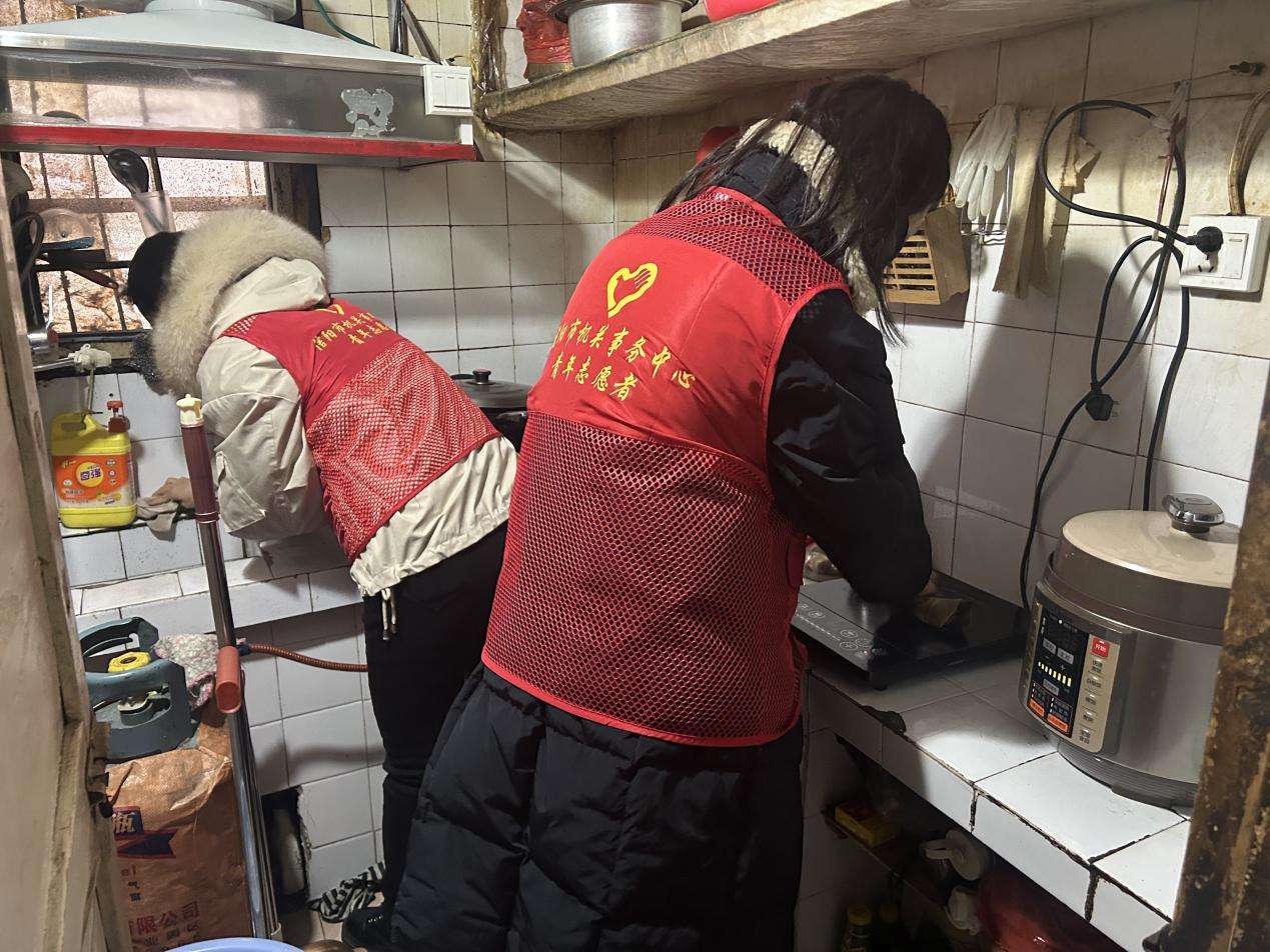 大桥社区联合市机关事务中心志愿者到辖区困难群众家中开展电线捆扎、家庭清洁等活动。