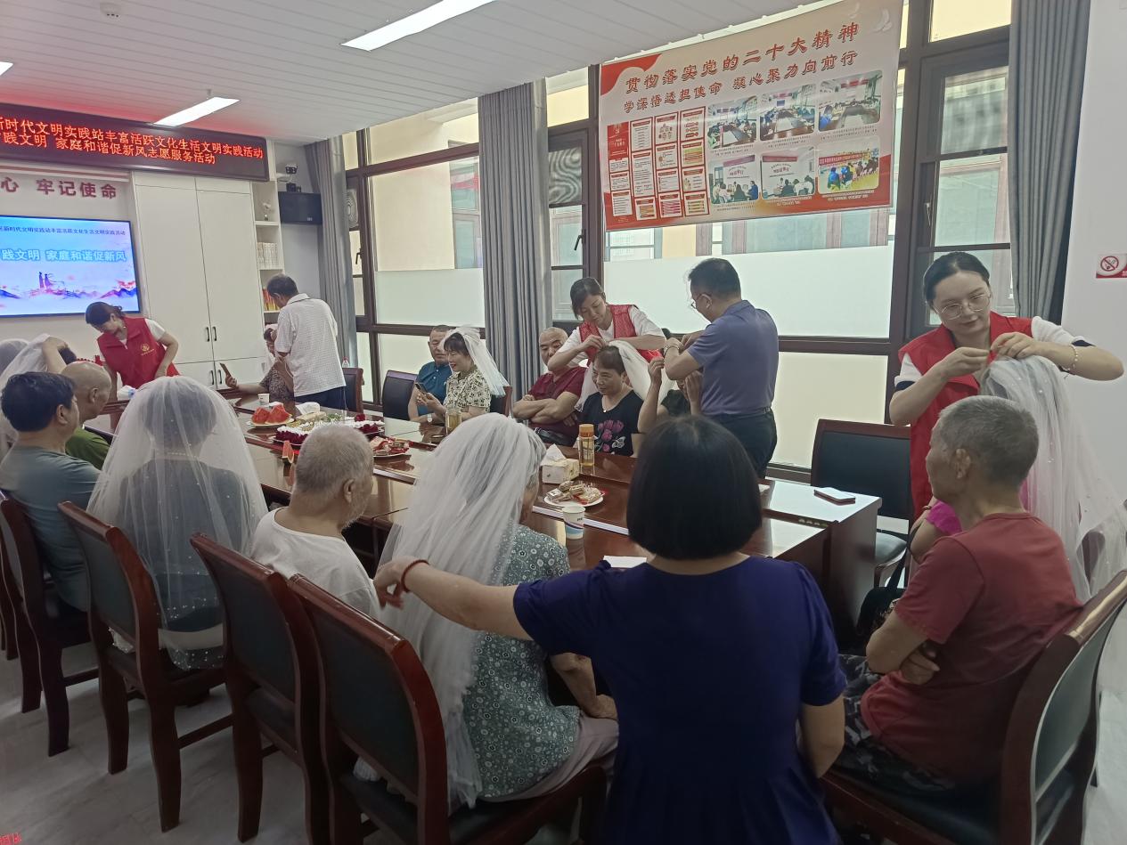 随后志愿者组织大家用相机定格甜蜜幸福瞬间,工作人员为阿姨们戴上头纱,拿着代表爱情的玫瑰花,看着叔叔阿姨脸上露出甜蜜的笑容,让在场居民感受到了他们平凡生活中透露出的和谐幸福,现场气氛十分热烈。