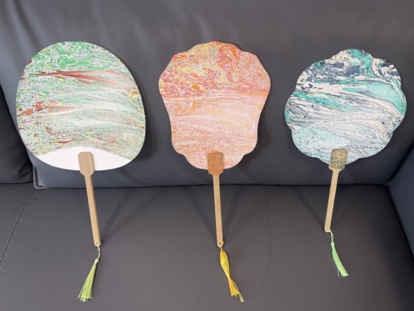 活动中,志愿者为群众讲解了端午节的由来以及习俗,为居民展示了国家非物质文化遗产“漆扇”的制作方法,并邀请现场群众参与体验。调漆、滴漆、拨纹……大家纷纷动手挑选自己喜欢的色彩,将创意与想象融入其中,利用漆不溶于水的特质,以点、甩、弹、划等手法在水面绘出图,入水一色,出水万彩,不一会,一把把蕴含着诗意美和诚挚祝福的扇子应运而生,原本白净的素扇变成了一幅幅美轮美奂的水墨画,居民们纷纷感叹中华传统文化的博大精深。在现场,志愿者还为群众佩戴五彩绳,为他们送去端午节日祝福。