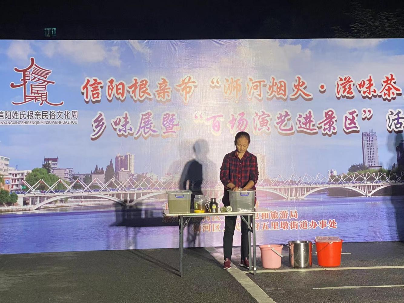 浉河区五里墩街道紧紧围绕市委、区委关于实施文旅文创融合战略的决策部署,在“行走河南·读懂中国”中叫响“美好生活看信阳”城市品牌。为丰富群众文化生活,使辖区群众感受到浓厚的节日氛围,在中秋、国庆双节来临之际,9月25日晚,五里墩街道在浉河北路市交通局门前组织开展“浉河烟火·滋味茶乡”乡味展暨“百场演艺进景区”文艺汇演活动。