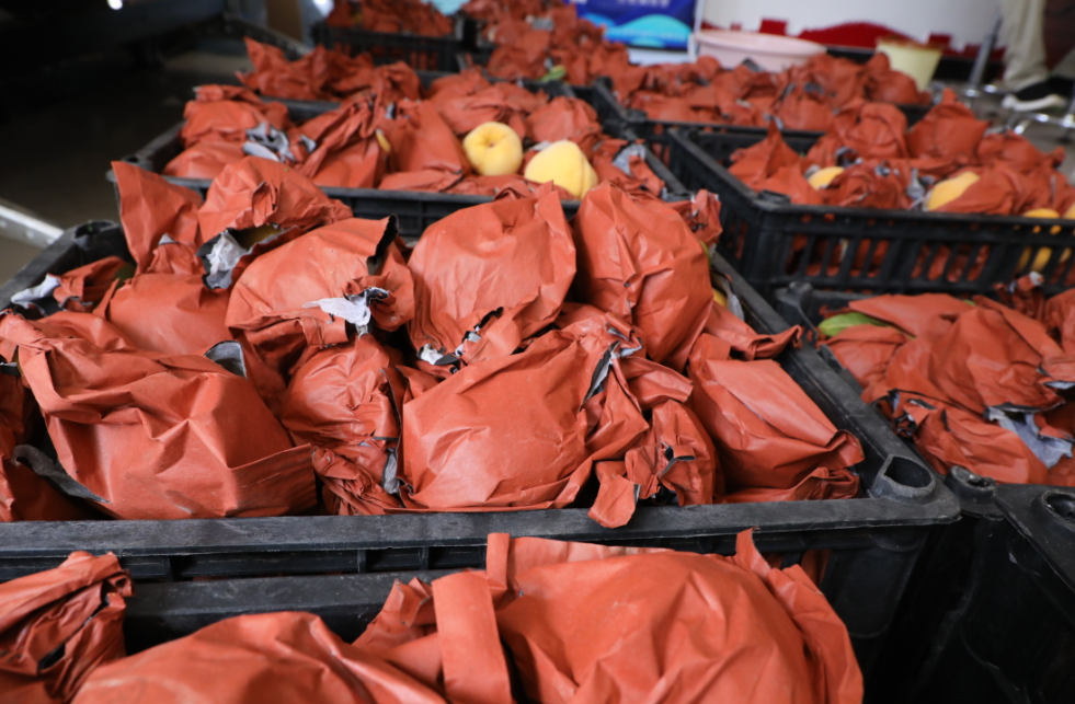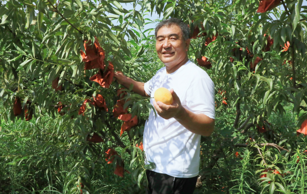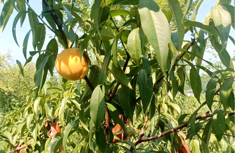 园子里,随处可见果农们忙碌的身影,摘果、去袋、挑拣、装篮,一筐筐黄桃被打包得整整齐齐。随着果农深入桃园,沁人的桃香扑面而来——只见一颗颗沉甸甸的黄桃缀满了桃树,把枝条都压弯了。