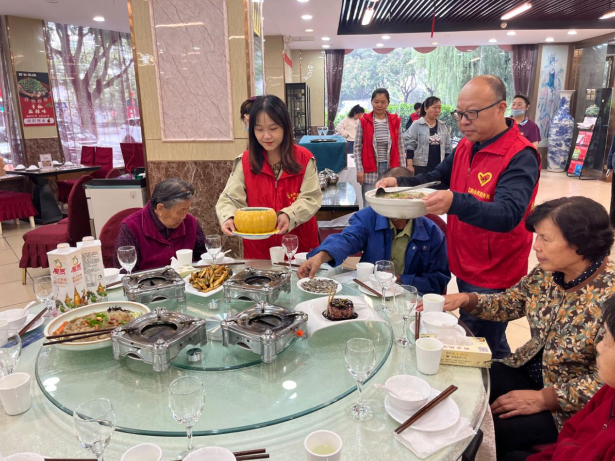随后志愿者们把空巢老人请到西关风情酒店,共吃团圆饭。“上菜啦!”中午十一时,伴着喜庆的音乐,志愿者们将香喷喷的饭菜齐齐端上了桌,热气腾腾的萝卜炖牛腩,清炖鸭汤,外酥里嫩的糖醋里脊,香甜可口的银耳莲子红枣羹……每一道菜都精心烹饪、营养美味。志愿者给每位老人倒上饮料,热气蒸腾的餐桌上,大家举杯共饮,互送祝福。餐桌旁顿时热闹了起来,充满了节日的欢乐氛围。正在吃饭的李师傅开心地说到:“这样的团圆饭真是好,我们也不感觉孤单了”。