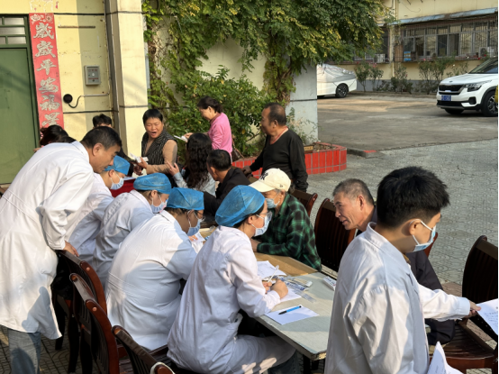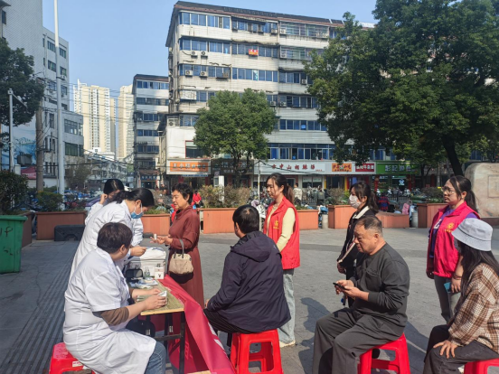 10月11日,民权街道幸福社区、四一社区联合信阳市第二中医院在万家灯火广场开展义诊活动,为前来问诊的社区老人们提供健康咨询和专业指导服务,并免费进行量血压、测血糖等医疗服务,医务人员耐心细致地为每一位居民进行检测,并根据结果提供个性化的健康建议。