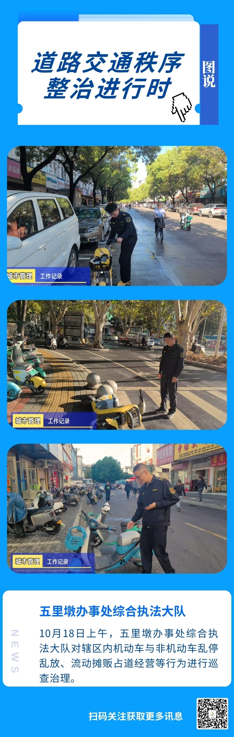 【图说】五里墩办事处综合执法大队:对辖区内机动车与非机动车乱停乱放、流动摊贩占道经营等行为进行巡查治理