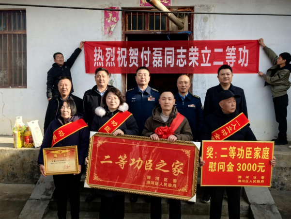 军营创佳绩,喜报入家门。1月21日,部队代表、信阳市退役军人事务局、浉河区人民武装部、浉河区退役军人事务局和十三里桥乡政府有关同志一行,到晏庙村为荣获二等功的现役军人付磊和家属披绶带、戴红花、颁喜报、送上慰问金,并致以热烈祝贺和崇高敬意。
