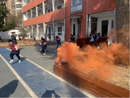 此次演练模拟信阳市第十三小学三里店分校,因教学楼电线线路起火导致学校发生重大险情,有数名学生、老师被困,学校校长将现场情况电话汇报消防部门和湖东办事处,请求协助处理险情。办事处人员立即赶赴现场,拉设警示带,应急疏散转移附近人员。