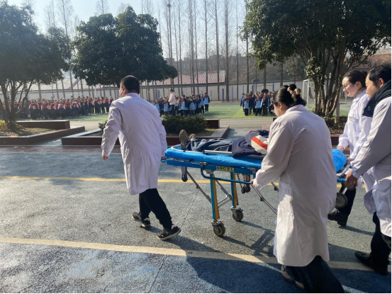 救援现场,应急疏散组负责灭火搜寻被困人员,同时将学校师生疏散转移至安全地带;现场警戒组负责拉设警戒带,摆放路锥禁停标识,清理校园周边车辆;医疗救护组负责用担架转移受伤师生,再用救护车转移驶离学校;突击抢险组负责开消防车进行喷水灭火。整个演练过程完全遵照“真训真演”的原则展开,全体参与人员听从指挥、行动有序、处置果断,演练任务圆满完成。