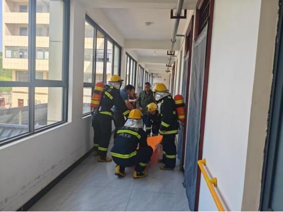 东双河镇消防队到达现场后立即开展救援工作,使用担架对二楼被困人员进行救援撤离,随后使用敬老院消防栓进行模拟灭火。