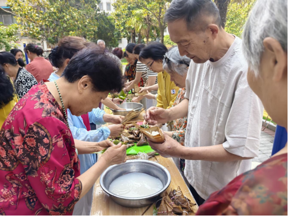 运动会结束后,大家围在桌前,开启包粽子环节。志愿者们提前备好糯米、粽叶等食材,经验丰富的居民耐心地向新手传授包粽子的技巧,“粽叶要这样卷,糯米不能放太满,绑绳子的时候要收紧……”在欢声笑语中,一片片清香的粽叶、一粒粒晶莹的糯米,在居民们的手中变成了一个个饱满紧实的粽子。大家一边包粽子,一边唠家常,现场洋溢着浓浓的节日氛围与邻里温情。