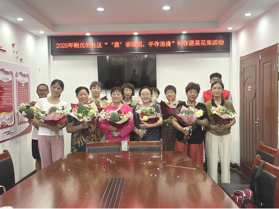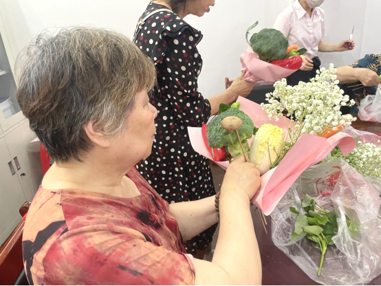 制作环节,居民们热情高涨,纷纷大展身手。大家充分发挥创意,把蔬菜变成了“花艺素材”。翠绿的西蓝花、鲜嫩的生菜、橙红的胡萝卜,还有白色的满天星,都成了制作花束的好材料。大家互相协作,有的居民仔细调整着西蓝花的位置,有的居民用胶带将胡萝卜、彩椒等蔬菜紧紧缠绕固定。不一会儿,一束束造型别致、充满生活气息的蔬菜花束就逐渐成型了。居民们拿着自己的作品,脸上洋溢着喜悦,张阿姨举着花束笑着说道:“真没想到普通的蔬菜能变得这么好看,以后做菜可得把食材都好好利用起来,不能浪费了。”大家围坐在桌前,专注地挑选、摆弄着各类蔬菜,相互交流制作心得;还有居民拿着做好的蔬菜花束,和大家一起开心合影,每一束花束都色彩鲜艳、创意十足。